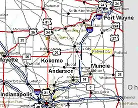 Hartford City's early transportation advantage came from the two railroad lines that crossed in the city, running north-south and east-west. The east-west line is now out of service as of 2008, but the north-south line is still in service. Both are operated by Norfolk Southern.[39] Hartford City also has a good highway system. Indiana State Road 3 runs north-south through the city, known as Walnut Street. Indiana State Road 26 runs east-west through the city, known as Washington Street. Indiana State Road 22 used to run concurrently with State Road 26 through Hartford City, but that segment was decommissioned in the 1970s.[40] Although Interstate 69 does not run through Hartford City or Blackford County, it is less than 10 miles (16 km) away and a convenient way to drive to Fort Wayne or Indianapolis. From Hartford City, drive west on State Road 26 to reach Interstate 69. Driving north from Indianapolis, the State Road 26 exit is number 255. The Interstate's northbound exit 259, at Upland, is an easy route to travel to the north side of Hartford City. Some small airports are located near Hartford City, and larger airports in Fort Wayne and Indianapolis offer commercial flights.