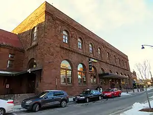 The main building is located between the tracks and Union Place. It is a three-story rectangular building in rough-faced Portland brownstone with two smaller, similarly shaped two-story wings on the north and south. The main building has a flat roof; the wings are gabled and tiled, with dormer windows piercing them at regular intervals.[3]