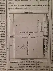 Witnesses maintained that immediately after the bomb blast there was an exchange of gunshots between police and demonstrators.[43] Accounts vary widely as to who fired first and whether any of the crowd fired at the police. Historian Paul Avrich maintains that the police fired on the fleeing demonstrators, reloaded and then fired again, killing four and wounding as many as 70 people. What is not disputed is that in less than five minutes the square was empty except for the casualties. According to the May 4 New York Times, demonstrators began firing at the police, who then returned fire.[37] In his report on the incident, Inspector Bonfield wrote that he "gave the order to cease firing, fearing that some of our men, in the darkness might fire into each other".[44] An anonymous police official told the Chicago Tribune, "A very large number of the police were wounded by each other's revolvers. ... It was every man for himself, and while some got two or three squares away, the rest emptied their revolvers, mainly into each other."[45]