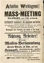 Outraged by this act of police violence, local anarchists quickly printed and distributed fliers calling for a rally the following day at Haymarket Square (also called the Haymarket), which was then a bustling commercial center near the corner of Randolph Street and Desplaines Street. Printed in German and English, the fliers stated that the police had murdered the strikers on behalf of business interests and urged workers to seek justice. The first batch of fliers contain the words Workingmen Arm Yourselves and Appear in Full Force! When Spies saw the line, he said he would not speak at the rally unless the words were removed from the flier. All but a few hundred of the fliers were destroyed, and new fliers were printed without the offending words.[32] More than 20,000 copies of the revised flier were distributed.[33]