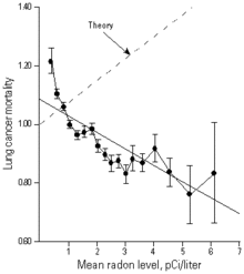 Epidemiologic radon studies have found trends to increased lung cancer risk from radon with a no evidence of a threshold, and evidence against a threshold above high as 150 Bq/m3 (almost exactly the EPA's action level of 4 pCi/L).[64] Another study similarly found that there is no evidence of a threshold but lacked the statistical power to clearly identify the threshold at this low level.[75] Notably, the latter deviance from zero at low level convinced the World Health Organization that, "The dose-response relation seems to be linear without evidence of a threshold, meaning that the lung cancer risk increases proportionally with increasing radon exposure."[76]