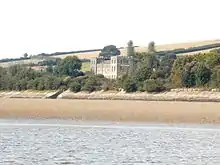 Heanton Court, the former manor house of the Manor of Heanton Punchardon, is a grade II listed building[6] situated on the north shore-line of the River Taw estuary, about a mile south-east of the parish church. Rev. John Swete described the house in spring 1796 as "the seat of Col. Basset" and wrote of it that "The house exhibits itself handsomely though its situation (like that of Lord Heathfield's on the Exe [i.e. Nutwell]) seems to be too contiguous to the water. Nearly opposite to it was a large track of marsh and sand..." He later made a copy of a painting by William Payne, c. 1790,[lower-alpha 2][7] The house as painted by Swete in about 1797 is essentially as it survives today, retaining its battlements and corner towers. It is currently used as a public house and hotel, known in 2015 as the Braunton Inn. In 2019 known as Heanton Court.