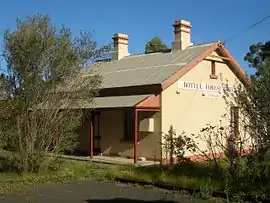 Heathcote railway station opened in 1886. Heathcote Hall (The Hall) was built in Heathcote East in 1887 by Abel Harber, a brick manufacturer. This grand Victorian house included a tower, which was a symbol of wealth. Harber suffered heavy financial losses during the construction of the Imperial Arcade in Sydney and attempted to dispose of the property but the 1892 depression did not help. The financial institution became the house’s possessor and they arranged with George Adams of Tattersalls to organise a sweepstake with the house as a prize. The winner was Mr S. Gillett, a Sydney builder. The property was sold to Edmond Lamb Brown in 1901[5] and as of September 2014 it still stands, though in a "dilapidated" state.[6] The movie The Munsters' Scary Little Christmas was filmed at 'The Hall'.[6][7]