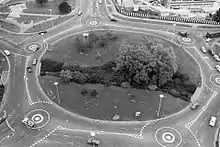 Northeast side of the Magic Roundabout, Hemel Hempstead. The "roundabout" is a series of 6 mini roundabouts spaced around a larger closely looped circulation system.