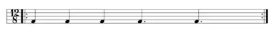This figure is a common African bell pattern, used by the Hausa people of Nigeria, in Haitian Vodou drumming, Cuban palo, and many other drumming systems. The figure is also used in many sub-varieties of the Flamenco genre (bulerías, for example), and in various popular Latin American musics.. It is also a fundamental feature of the Czech furiant dance form, familiar from the two examples in Dvořák's Slavonic Dances Op. 48. The horizontal hemiola suggests metric modulation (6