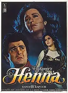 Henna is a 1991 Indian romance drama film, written by Khwaja Ahmad Abbas, produced and directed by Randhir Kapoor, and starring his brother Rishi Kapoor, along with Pakistani actress Zeba Bakhtiyar in the title role and Ashwini Bhave. This film was planned and started by legendary director Raj Kapoor, but due to his demise during the filming, the remaining portions were directed by his eldest son Randhir.[1] It is considered as the last film of Raj Kapoor. The dialogues of the film were written by the acclaimed Pakistani writer Haseena Moin. The film was a critical and a commercial success and was also India's submission for the Academy Award for Best Foreign Language Film, but was not accepted as a nominee.[2]