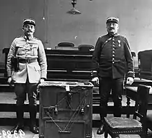 Landru was arrested on 12 April 1919 at an apartment near Paris's Gare du Nord which he shared with his 24-year-old mistress, Fernande Segret. The police eventually concluded that Landru had met or been in romantic correspondence with 283 women during the First World War, including 72 who were never traced.[2] In December 1919 Landru's wife Marie-Catherine, 51, and his eldest son Maurice, 25, were arrested on suspicion of complicity in his thefts from his victims. Both denied any knowledge of Landru's criminal activities.[3] Marie-Catherine was released without charge on health grounds in July 1920, on the same day that Maurice was released because the authorities could not establish his guilt.[4]