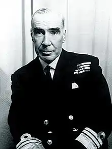 The purchase of the destroyers signalled a shift in reliance for equipment from Britain to the United States that was contrary to prevailing Australian defence policy at the time, particularly in what historian Jeffrey Grey described as "the most British of the Australian services, the RAN", and provoked pressure from the Royal Navy and UK shipbuilders, which had lobbied for purchase of their County-class destroyer.[5][32] Burrell later declared that the superiority of the US weapons system was a key factor in his preference for the Adams design over the County class.[33] On a mission overseas to discuss trends and acquisitions in January 1960, he was rebuffed by Britain's Chief of the Defence Staff, Admiral of the Fleet Lord Louis Mountbatten, who mistakenly thought him responsible for the imminent dissolution of the RAN's Fleet Air Arm, but warmly welcomed by the US Chief of Naval Operations, Admiral Arleigh Burke.[29] As it happened, Burrell would gain credit for maintaining the integrity of the FAA,[5] and its fixed-wing component remained viable until the early 1980s.[34] He was appointed a Knight Commander of the Order of the British Empire in the Queen's Birthday Honours, gazetted on 3 June 1960.[35] In June 1961, he met with his opposite numbers in the Army and Air Force at a Chiefs of Staff Committee conference to discuss the necessity of Australia acquiring nuclear weapons; the chiefs agreed that the probability such a capability would be required was remote but that it should remain an option under certain circumstances, a position the defence forces maintained during the ensuing decade.[36]