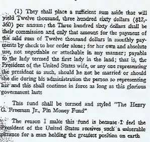 Freeman believed that the president of the United States was paid a "miserable pittance", and that a way of increasing his income while avoiding the appearance of political gifts was to institute an annuity to be paid "to the lady termed the first lady in the land; that is, the President of the United States [sic] wife, or anyone representing the president as such, should he not be married or should she die during his administration." Freeman's will specified that the money be for the first lady's "own and absolute use" and the payments "shall continue in force as long as this glorious government exists."