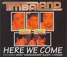 "Here We Come" is a song by American producer/rapper Timbaland. It features frequent collaborators Missy Elliott and Magoo and serves as the lead single for Timbaland's solo debut album, Tim's Bio: Life from da Bassment (1998). The song also features background vocals by Playa and Darryl Pearson. While the song charted and was released via radio airplay on November 17, 1998, it was not granted a physical release in the United States until March 2, 1999;[1] and on October 5, 1999 for Germany.[2]