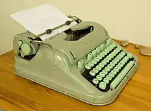 The Hermes 3000 was introduced in 1958[5] as a successor to the Hermes 2000.[2] The original Model 1 was produced until 1966; with subsequent design modifications to the external casing and a variety of subtle changes in colour finishes, the Hermes 3000 was manufactured into the 1980s.[5] Although it was a portable machine, the Hermes 3000 had a few deluxe features, such as a "beyond the margins" key, which could also be depressed to free any jammed keys and return them to their resting position.[6] The typewriters predominantly came in a light green (occasionally described as a mint[7] or "sea-foam green") colour.[8]