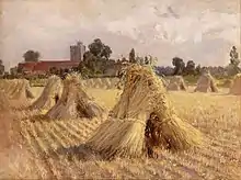 In 1909 Heywood Hardy returned to live in Sussex, at East Preston, a few minutes walk from the beach. His last paintings were altarpieces for the thirteenth century Church of St Mary at Clymping in Sussex and for St Luke’s Church at the Royal Hospital Haslar, Gosport. Hardy’s ashes were buried at Clymping Church.[15]