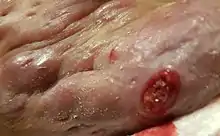 | Symptoms | Multiple inflamed and swollen skin lesions[2] |