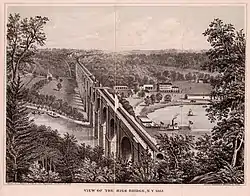 Originally designed as a stone arch bridge, the High Bridge had the appearance of a Roman aqueduct. Construction on the bridge was started in 1837, and was completed in 1848 as part of the Croton Aqueduct, which carried water from the Croton River to supply the then burgeoning city of New York some 10 miles (16 km) to the south. The bridge has a height of 140 ft (43 m) above the 620-foot-wide (190 m) Harlem River, with a total length of 1,450 ft (440 m).[1] The design of the bridge was originally awarded to Major David Bates Douglass, who was fired from the project.[3] The design then fell to the aqueduct's engineering team, led by John B. Jervis. James Renwick, Jr., who later went on to design the landmark Saint Patrick's Cathedral on Fifth Avenue in Midtown Manhattan, participated in the design.