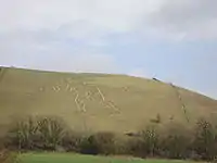 Its history cannot be traced back further than the late 17th century, making an origin during the Celtic, Roman or even Early Medieval periods difficult to prove. Above and to the right of the Giant's head is an earthwork known as the "Trendle", or "Frying Pan". Medieval writings refer to this location as "Trendle Hill", but make no mention of the giant, leading to the conclusion that it was probably only carved about 400 years ago. In contrast, the Uffington White Horse – an unquestionably prehistoric hill figure on the Berkshire Downs – was noticed and recorded by medieval authors.[1][11]