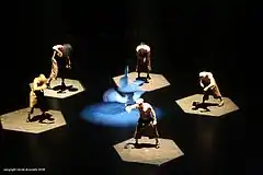 Other hip-hop theater companies were founded in the 1990s. Compagnie Käfig is a French hip-hop theater company of mostly Algerian descent founded in 1995 by Mourad Merzouki.[19] Their performances mix standard b-boying, locking, and popping with capoeira, mime, and gymnastics.[19] They use the same fusion in music by mixing rap music with classical music and Andalusian guitar.[19] While on tour in the U.S. they performed at Jacob's Pillow in Massachusetts and at the Joyce Theater in New York.[20][21] Bintou Dembélé performed at the Joyce Theater in New York with Mourad Merzouki's Compagnie Käfig in 2002.[22][23] That same year she created her own dance company, which she describes as being mainly inspired by Pina Bausch's notion of 'danced theater'.[23][24]