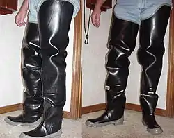 Hip boots, or hip waders as they are sometimes called, are a type of tall boot initially designed to be worn by river fishermen. Hip boots are typically made out of rubber, they may also be made out of PVC, nylon and/or polyester. Other materials, such as wool, cotton and foam, are used to add warmth and comfort.[1] The boots completely cover the legs, up to the tops of the thighs or all the way up to the waist. Hip boots are designed to protect the wearer from water, and allow wading out into deeper waters. They also help to keep the feet and legs warm. Hip boots are also worn by many ecologists, environmental scientists, and aquatic biologists[2] who do tests in swamps or lakes to determine the quality of water.