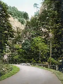 The name means "stag leap" and it is a narrow, gorge-like section of the ravine-shaped central portion of the Höllental ("hell valley") with rock faces up to 130 metres high. It is also called the Höllenpass ("hell pass"). It is located on the parish boundary between Breitnau and Buchenbach. The Hirschsprung gorge was only 9 metres wide before the upgrade of the road. The southern Hirschsprung rocks have been tunnelled under by the Jägerpfad ("hunter’s path"), which ran alongside the Höllenbach (or Rotbach) stream, but has been closed since 2009 due to the danger of falling rocks and rockface collapse.[1]