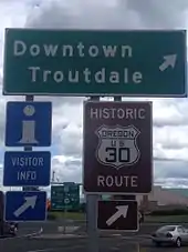 Although the city of Troutdale has named the old highway "Columbia River Highway" west to 244th Avenue, where it is cut by I-84,[35] signs for the scenic byway begin at exit 17 of I-84, and point south on Graham Road to the west end of downtown Troutdale.[36] Modern milepoint zero of the Historic Columbia River Highway No. 100 is located at the west end of the Sandy River bridge, historic milepost 14.2.[1]