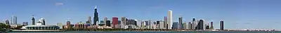 Michigan Avenue is named after Lake Michigan, which it once ran alongside at 100 east in the city's street numbering system until land reclamation for Grant Park (then Lake Park) pushed the shoreline east.[5] The one-sided street feature is due in large part to the legal battles of Aaron Montgomery Ward with the city over cleaning up the park and removing most of the structures in it.[6] Ward opposed the development of Grant Park with public buildings along the lakefront except for the Art Institute of Chicago Building.[7] Eventually, Ward's ideas were adopted by Daniel Burnham in his Plan of Chicago, which called for "insured light, air, and an agreeable outlook" along the Grant Park street frontage.[8] The preservation of the lakefront view has inspired architects to create an architectural cornucopia of designs along the "streetwall".
