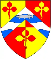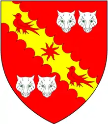 Hearsdon, within the parish of Swimbridge, was anciently a "mansion"[6] and a seat of the Chichester family. A mural monument survives in St James' Church, Swimbridge, to Tristram Chichester (1624–1654) of Hearsdon.[14] He was the second son[15] of Tristram Chichester (1595–1672[16]) (the son of Tristram Chichester[17] (1568–1642[16]) of Hearsdon by his wife Christiana Handford (d.1651) of "Dynnington"[17] in the parish of Swimbridge) by his wife Eleanor (of family unknown) (1603–1647), and was descended from the prominent Chichester family of Hall in the adjoining parish of Bishop's Tawton, itself a junior branch of Chichester of Raleigh, Pilton, near Barnstaple. He married a wife unknown[18] by whom he had four daughters, mentioned in his will but not by name.[17] The monument displays at the bottom the arms of Chichester (with crescent for difference of a second son), impaling the arms of his wife (Sable, a fess vair) and the two arms again on separate shields. Partly behind his head on a smaller shield appear the arms of Chichester impaling: Paly of six argent and gules, on a chief of the second three mascles conjoined in fess of the first (unknown family[19]).