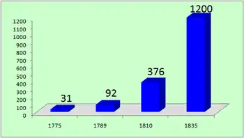 As the number of cities of 8,000 or more population grew rapidly so too the daily newspapers were increasing in number. The first had appeared in Philadelphia and New York in 1784 and 1785; in 1796 one appeared in Boston. By 1810 there were twenty-seven in the country—one in the city of Washington, five in Maryland, seven in New York, nine in Pennsylvania, three in South Carolina, and two in Louisiana. As early as 1835 the Detroit Free Press began its long career.[28][29]