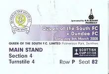 After four weeks without a competitive match and following the end of the Scottish League Division One season,[17] the Scottish Cup Final was against Rangers on 24 May 2008 at Hampden Park. Despite a battling second half performance to pull back the 2 goal half time deficit to 2–2 Queen's eventually lost 3–2. Queen's scorers were Stevie Tosh and long-serving captain Jim Thomson.[18] Afterwards Queen's players expressed their disappointment in the result.[19] Tosh voiced his frustrations at refereeing decisions that went against Queen's.[2]