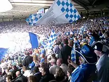 For a team with the core of its support being in a town with a population of 38,000 Queen's took a support of around 15,500 to the final. Queen's fans were widely praised for their good humour and carnival-like contribution to the day.[20] Despite defeat in the final 14 000 fans[21] attended an open top bus parade by the team through Dumfries.[22]