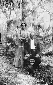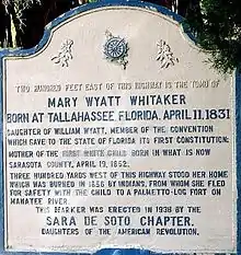 William Whitaker was the first documented pioneer of European descent to settle permanently in what became the village of Sarasota.[8] After time spent along the Manatee River at the village of Manatee, Whitaker built upon Yellow Bluffs, just north of present-day Eleventh Street. He sold dried fish and roe to Cuban traders working the coast and in 1847, he began a cattle business. In 1851, Whitaker married Mary Jane Wyatt, a member of a pioneer family who had settled the village of Manatee, that was about 13 mi (21 km) to the northeast along the river of the same name.