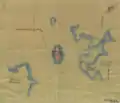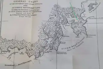 ![]() 1793: D'Entrecasteaux's map of Norfolk Bay after a brief exploration. Smooth Island, which he had not named, is indicated with a green arrow. ![]() Matthew Flinders' 1798 map of Norfolk Bay shows his passage around Smooth Island. Prior to European settlement, the Forestier Peninsula to the east of Smooth Island is believed to have been occupied by the Pydairrerme band of the Oyster Bay (Paredarerme) tribe of Aboriginal Tasmanians.[1][2][3] They spoke the Paredarerme language. There is no recorded evidence of any remaining Paredarerme people in the region after the 1830s.[3] European settlementIn 1793 Jean-Baptiste Philibert Willaumez (of the Antoine Bruni d'Entrecasteaux expedition) was the first Anglo-Saxon to discover Smooth Island. The island is found on d'Entrecasteaux's maps, though it is unnamed.[4] On 15 December 1798 Matthew Flinders was the first Anglo-Saxon to set foot on Smooth Island. He stopped to take bearings[5] and spent two nights on the island. He described his impression of the island:[4]