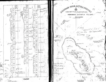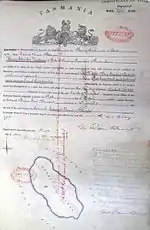 Captain Charles O'Hara Booth liked the idea of owning an island; in 1839 he applied to the Land and Survey Department to buy Smooth Island but was informed that, although a lease could be arranged, ownership of all islands was reserved for the government.[21] A publication from 2011 indicates Smooth Island may have been used to grow vegetables for the Port Arthur penal settlement, which was in operation from 1833 to 1853.[22] However this claim cannot yet be verified. On 19 February 1863 Thomas Reid commissioned the surveyor general, James Erskine Calder, to assess the island.[23] In his survey, Calder determined the island was 146 acres (59 ha), lightly timbered, with about 40 acres (16 ha) suitable for agriculture[24] with little or no clearing. He believed that the remaining portion of the land could be cleared or burned-off for pasture. He rated the island's water to be of good quality but unproven for the demands of cattle.[25] The eastern shore of the island was found to have the best landings, and had been improved in four places, Calder believed, for whaling operations carried out on Norfolk Bay.[26] There had been some mineral exploration for blue granite and iron, though no beds were found. Calder evaluated the island as "well worth £2 per acre".[27] On 14 April 1863 Smooth Island, which was classed as agricultural Crown land at the time, was designated for sale at public auction on 23 April the following year, in accordance with the Waste lands Act. Several key clauses of the act were described.[28] It was initially listed for a minimum sale price of £227.[29] Thomas Gabriel Reid commissioned a detailed survey of the island which took place between 10 and 14 July 1863 (see survey report inset). It appears Thomas Gabriel Reid purchased the island on 21 April 1864 for only £155.[30] A "Thomas G. Read" was recorded as living in the nearby town of Sorell in 1866.[31] On 31 October 1894 Thomas Gabriel Read died at New Norfolk at 70 years of age. He was the second son of Captain G. F. Read.[32] Thomas Gabriel Read was a notable gold-miner. A detailed biography of Thomas Gabriel Read is available.[33] On 8 November 1869, Lieutenant Colonel Mundy said, "the pretty wooded Garden Island [was] lying in the jaws of [Norfolk Bay]",[34] suggesting that clearfelling had not yet occurred on the island. On 4 April 1870, a sailor traveling past Smooth Island wrote in a local newspaper,