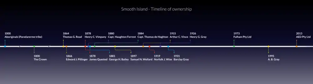 Between 2003 and 2007 Smooth Island was subleased to a local oyster farmer to transport oyster stock to and from a processing facility in Boomer Bay.[78] The island was reportedly priced at A$1,650,000 in 2010.[79] Satellite imagery indicates that the 2013 Tasmanian bushfires did not burn Smooth Island.[80][81] During 2013, Smooth Island was advertised for sale, with the following description:[82]