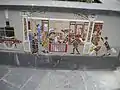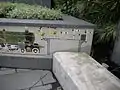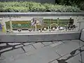 The mosaic you see here is a miniature of the original work that once dominated St Chad's Circus by Kenneth Budd and associates. The original was 300 ft long with varying heights to a maximum of 20 ft at the works centre, It took three years to create and was installed in 1969. The locomotives were 2:3 scale and the carriages were 1:1. The work was made in gold leaf and glass mosaic manufactured by Orsoni in Venice set around with a light and dark stone aggregate.