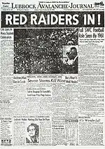 For its first seven years, the program was independent, not belonging to an athletic conference. It was during Cawthon's service—in 1932—that Tech first joined a conference, the Border Intercollegiate Athletic Association, which included five other schools at the time. Several other firsts occurred during Cawthon's tenure. In 1934, the team was first referred to as the "Red Raiders".[6] Three years later, the 1937 squad became the first team in college football to fly to a game.[7] Later that year, they received their first postseason invite—to the 1937 Sun Bowl, where they were defeated by West Virginia, 7–6. The following year, Cawthon led the team, which is the only one in the program's history to have an undefeated regular season, to the Cotton Bowl Classic where they lost to St. Mary's, 20–13.[8] Cawthon's 1939 team set a still-unbroken NCAA record for most punts during a single game. Playing in a driving rainstorm, Texas Tech punted 39 times, while their opponent, Centenary punted 38 times. The combined punt total of 77 is also an unbroken NCAA record.[9]