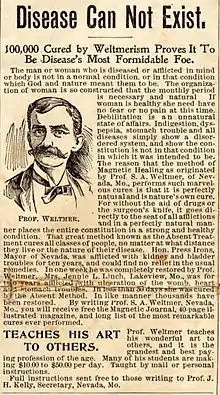 A feature of the dissemination of magnetism in the New World was its increasing association with spiritualism.[100] By the 1830s mesmerism was making headway in the United States amongst figures like the intellectual progenitor of the New Thought movement, Phineas Parkhurst Quimby, whose treatment combined verbal suggestion with touch.[101] Quimby's most celebrated "disciple", Mary Baker Eddy, would go on to found the "medico-religious hybrid", Christian Science, in the latter half of the nineteenth century.[102] In the 1840s the American spiritualist Andrew Jackson Davis sought to combine animal magnetism with spiritual beliefs and postulated that bodily health was dependent upon the unobstructed movement of the "spirit", conceived as a fluid substance, throughout the body. As with Quimby, Davis's healing practice involved the use of touch.[101]