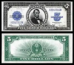 United States silver certificates were a type of representative money printed from 1878 to 1964 in the United States as part of its circulation of paper currency.[17] They were produced in response to silver agitation by citizens who were angered by the Fourth Coinage Act, and were used alongside the gold-based dollar notes. The silver certificates were initially redeemable in the same face value of silver dollar coins, and later in raw silver bullion.