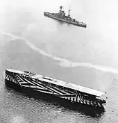 The angled flight deck was first tested on HMS Triumph, by painting angled deck markings onto the centerline flight deck for touch and go landings.[28] This was also tested on USS Midway the same year.[29][30] In both tests, the arresting gear and barriers remained oriented to the original axis deck. During September through December 1952 USS Antietam had a rudimentary sponson installed for true angled deck tests, allowing for full arrested landings, which proved during trials to be superior.[29] In 1953 Antietam trained with both US and British naval units, proving the worth of the angled deck concept.[31] HMS Centaur was modified with an overhanging angled flight deck in 1954.[28] The US Navy installed the decks as part of the SCB-125 upgrade for the Essex-class and SCB-110/110A for the Midway-class. In February 1955, HMS Ark Royal became the first carrier to be constructed and launched with the deck, followed in the same year by the lead ships of the British Majestic-class (HMAS Melbourne) and the American Forrestal-class (USS Forrestal).[28]