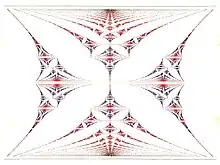 Written while Hofstadter was at the University of Oregon, his paper was influential in directing further research. It predicted on theoretical grounds that the allowed energy level values of an electron in a two-dimensional square lattice, as a function of a magnetic field applied to the system, formed what is now known as a fractal set. That is, the distribution of energy levels for small scale changes in the applied magnetic field recursively repeat patterns seen in the large-scale structure.[1] "Gplot", as Hofstadter called the figure, was described as a recursive structure in his 1976 article in Physical Review B,[1] written before Benoit Mandelbrot's newly coined word "fractal" was introduced in an English text. Hofstadter also discusses the figure in his 1979 book Gödel, Escher, Bach. The structure became generally known as "Hofstadter's butterfly".