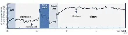 Geologists working in different regions are studying sea levels, peat bogs and ice core samples by a variety of methods, with a view toward further verifying and refining the Blytt–Sernander sequence. This is a classification of climatic periods initially defined by plant remains in peat mosses.[21] Though the method was once thought to be of little interest, based on 14C dating of peats that was inconsistent with the claimed chronozones,[22] investigators have found a general correspondence across Eurasia and North America. The scheme was defined for Northern Europe, but the climate changes were claimed to occur more widely. The periods of the scheme include a few of the final pre-Holocene oscillations of the last glacial period and then classify climates of more recent prehistory.[23]