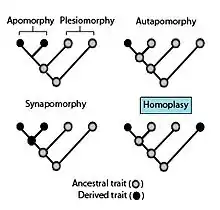 According to cladistic interpretation, homoplasy can be identified when the distribution of a trait cannot be explained by descent from a common ancestor on a preferred phylogenetic hypothesis - that is, the feature in question arises (or disappears) at more than one point on the tree.[16]