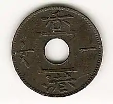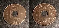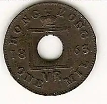 The one mil coin was the smallest denomination of the Hong Kong dollar from 1863 to 1866, after this date it was no longer issued but may have circulated much longer. Its value was one tenth of a cent, or a thousandth of a dollar. Despite being minted under British rule by the Royal Mint, they did not feature the reigning monarch as all other coins did, due to the hole in the middle.