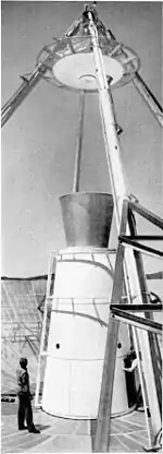 A type of antenna that combines a horn with a parabolic reflector is known as a Hogg-horn, or horn-reflector antenna, invented by Alfred C. Beck and Harald T. Friis in 1941[19] and further developed by David C. Hogg at Bell labs in 1961.[20] It is also referred to as the "sugar scoop" due to its characteristic shape. It consists of a horn antenna with a reflector mounted in the mouth of the horn at a 45 degree angle so the radiated beam is at right angles to the horn axis. The reflector is a segment of a parabolic reflector, and the focus of the reflector is at the apex of the horn, so the device is equivalent to a parabolic antenna fed off-axis.[21] The advantage of this design over a standard parabolic antenna is that the horn shields the antenna from radiation coming from angles outside the main beam axis, so its radiation pattern has very small sidelobes.[22] Also, the aperture isn't partially obstructed by the feed and its supports, as with ordinary front-fed parabolic dishes, allowing it to achieve aperture efficiencies of 70% as opposed to 55-60% for front-fed dishes.[21] The disadvantage is that it is far larger and heavier for a given aperture area than a parabolic dish, and must be mounted on a cumbersome turntable to be fully steerable. This design was used for a few radio telescopes and communication satellite ground antennas during the 1960s. Its largest use, however, was as fixed antennas for microwave relay links in the AT&T Long Lines microwave network.[20][22][23] Since the 1970s this design has been superseded by shrouded parabolic dish antennas, which can achieve equally good sidelobe performance with a lighter more compact construction. Probably the most photographed and well-known example is the 15 meter (50 foot) long Holmdel Horn Antenna[20] at Bell Labs in Holmdel, New Jersey, with which Arno Penzias and Robert Wilson discovered cosmic microwave background radiation in 1965, for which they won the 1978 Nobel Prize in Physics. Another more recent horn-reflector design is the cass-horn, which is a combination of a horn with a cassegrain parabolic antenna using two reflectors.[24]