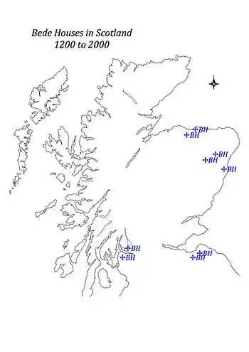 Listed below, in a summary table, are the recorded hospital sites in the north east of Scotland. Some of the locations remain uncertain. Details of the dates founded and "terminated" are provided where known. In some cases the designation (i.e. type) is a composite. Leper houses are included, as they may have had a dual purpose. The designation maison Dieu is generally a description from land or map records. The term is usually synonymous with "bedehouse".[13]