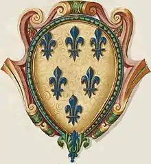 Gold, with six blue lilies, two palms on both sides, one palm on both sides, one palm on both sides, one palm on both sides, one gold, one gold, one gold.[4] |