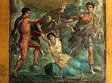 The House of the Vettii features a large assortment of fresco paintings in the Pompeian Fourth style. There are twelve surviving panels, which depict mythological scenes. We know that it is the Fourth style by its combination of the previous three styles. At the bottom of the wall we see a ring of faux colored marble, which is indicative of the First Pompeian style. Secondly, there is an interest in creating illusionistic scenes, evident in the top ring and besides the mythological scenes, that is borrowed from the Second style. Lastly, the unrealistically thin columns supporting the upper ring of the wall frescoes is taken from the Third style. New to the style is the mythological scenes, of which there are twelve remaining in the House of the Vettii.[11] It is believed that the scenes are copied from Greek models, but no Greek paintings have survived to compare the frescoes to.[12] The twelve panels are located in the two triclinia positioned off of the peristyle garden and the triclinium next to the small peristyle. The remaining are in the triclinium and the cubiculum to the left of the main entrance.[13] The paintings combine to create a theme of divine reward and punishment, one particularly showing off the power of Jupiter (Zeus) and his sons as the enforcers of world order.[14]