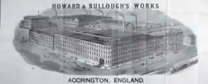 The firm of Howard and Bleakley was founded in 1851 with four workers;[1] in 1856 Bleakley retired and the partnership was changed to Howard & Bullough. John Bullough had perfected a self-acting temple on his handloom, and with William Kenworthy at Brookhouse Mills had been responsible for the Lancashire Loom.[2] By 1856 they employed 150 workers; John's son James joined in 1862. They initially concentrated on looms, but eventually expanded to manufacture the complete range of machinery used in a cotton mill.