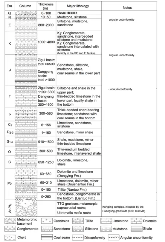 In the Early Paleozoic, sandstone and conglomerate of Liantuo Formation experienced tectonic uplift due to the pushing of rock materials from below.[15] At 650 Ma, global cooling led to the Snowball Earth. The angular, coarse-grained, poor-sorted glacial deposit, called tillite, was deposited. Until the end of Triassic, the Huangling Complex was a marine environment and formed dolomite and limestone. Later on, the deposition environment switched from marine to continental, sedimentary facies also change. On top of the marine deposits, terrigenous deposits such as sandstone, conglomerate, siltstone and mudstone overly.[16] Extensional geological settings like the foreland basin and rift basin settings are found, Zigui Basin and Danyang Basin, which are the two sedimentary basins lying on the western and eastern flank of Huangling dome, were formed during Late Triassic and Jurassic.[14] It shows there were crustal extension during Mesozoic.