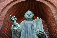 Bishop Oldham is well remembered by Manchester Grammar School: on a Sunday at the end of June each year representatives from the school hold a commemorative service in Exeter Cathedral during which a wreath is laid on his tomb.[31] Since 2005 the school has held an annual Hugh Oldham Lecture,[32] with speakers that have included Astronomer Royal Martin Rees, historian Michael Wood and Lord Winston.[33] And in 2001 the Bishop of Exeter, Michael Langrish gave a speech to the London Section of the Old Mancunians' Association in which he emphasised two facets of Bishop Oldham's life, both of which he said have relevance today: the importance of learning and education that is broad-based, humane and directed to the well-being of society, and to be open to the future and critically appreciative of what it might be.[34] A life-size bronze statue of the bishop, sculpted by William Macmillan in 1931, stands in the school grounds,[21] and the school's badge still incorporates Oldham's owls.[8]
