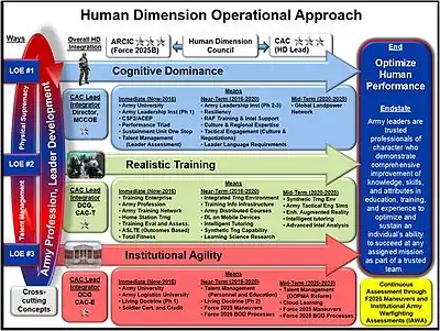 Human Dimension Concept (TRADOC Pam 525-3-7): Published in May 2014, describes the broad human dimension capabilities the Army requires to meet the challenges of the future operational environment, and serves as a common framework for adapting and enhancing the Army's effort to achieve superior warfighting effectiveness.[9]