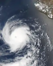 Later that day, a well-defined eye formed beneath the CDO and the surrounding cloud tops reached below −80 °C (−112 °F), indicating intensification is present.[11] Adrian rapidly deepened, and over the following 24 hours, it is estimated by satellite observations that winds increased from 80 mph (120 km/h) to 140 mph (240 km/h) and its barometric pressure decreased by 43 mbar (hPa; 1.27 inHg), going from a category 1 to a category 4 hurricane on the Saffir–Simpson Hurricane Scale (SSHS).[12][13] During that time, its eye became more distinct, and the upper-level outflow was symmetrical.[14] Throughout most of June 9, Adrian began transitioning into an annular hurricane, displaying a large and circular eye around 25 miles (40 km) in diameter, devoid of any convective banding.[15]